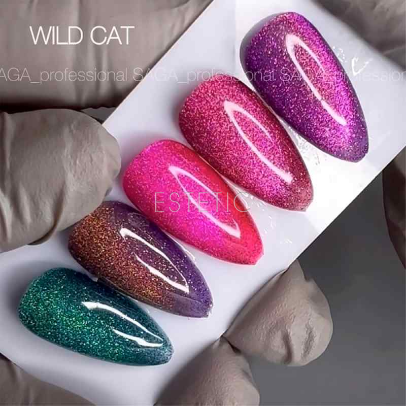 Saga Wild Cat – это коллекция гель-лаков с волшебным эффектом кошачьего глаза. При покрытии следует использовать специальный магнит для появления блика любой формы и глубины. Благодаря своему составу, гель-лаки имеют среднюю консистенцию, поэтому лучше всего смотрятся на темной подкладке, но можно использовать без подложки, создают интересный и красивый дизайн.