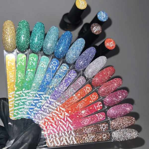 Valeri Gel Polish Flash – это коллекция трендовых гель-лаков, созданная для эффектного маникюра, идеально подходит как для полного покрытия ногтей, так и для создания акцентов на 1-2 пальчиках. Эти гель-лаки насыщены плотной концентрацией световозвращающего песка и глитера, что обеспечивает удивительный, мерцающий блеск при всех видах освещения, особенно интенсивно сияя под прямым светом или вспышкой камеры. Благодаря своей густой консистенции и высокой пигментации продукт можно наносить даже в один слой, получая равномерное и однородное покрытие без пробелов, что не создает лишней толщины и значительно сокращает время на процедуру.