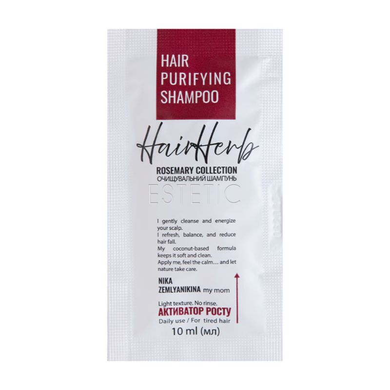 Шампунь очищающий для укрепления волос HairHerb от Nika Zemlyanikina с розмарином в саше объемом 10 мл – это удобный формат, идеальный для тестирования продукта перед покупкой большого объема или для путешествий. Этот шампунь разработан, чтобы эффективно очищать кожу головы и волосы от загрязнений и излишков себума, а также помогать укреплять волосяные фолликулы.